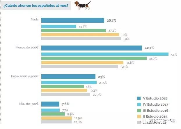 根据表格可以看出,每个月西班牙一分钱都存不下的“月光族”占了26.7%;能存200欧以下的占42.7%,而2017年此档人占54%;存款能在200欧到500欧之间的占23%;而存款超过500欧的仅占7.6%。
