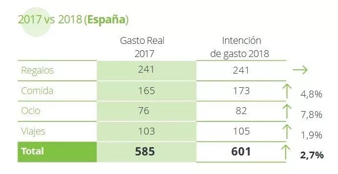 另一方面,根据Deloitte调查,今年西班牙家庭圣诞平均消费为601欧元,比去年的585欧元增加了2.7%。这也意味着,西班牙成为欧洲各国中圣诞消费排名第二的国家,仅次于英国。在所有消费中,礼品类消费为241欧元、食品类为173欧元,旅行类为105欧元以及其它娱乐开销82欧元。